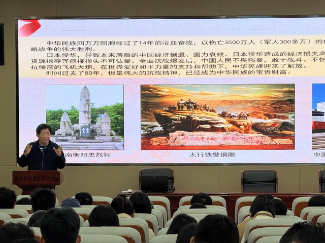 湯華明全面深入地講述了抗戰(zhàn)的經(jīng)歷、抗戰(zhàn)的文化、抗戰(zhàn)的精神,從“紅軍長(zhǎng)征與北上抗日”先遣隊(duì)的組建背景,到“反蔣抗日”向“聯(lián)蔣抗日”的戰(zhàn)略轉(zhuǎn)變邏輯;從“盧溝橋事變”“平型關(guān)大捷”“淞滬會(huì)戰(zhàn)”的戰(zhàn)場(chǎng)戰(zhàn)術(shù)交鋒,到“華北抗日根據(jù)地建設(shè)”“正面戰(zhàn)場(chǎng)系列會(huì)戰(zhàn)”“中國(guó)遠(yuǎn)征軍出國(guó)作戰(zhàn)”“雪峰山會(huì)戰(zhàn)”的全局戰(zhàn)略布局。他結(jié)合一手史料、戰(zhàn)役地圖及將領(lǐng)事跡、作戰(zhàn)數(shù)據(jù),清晰闡釋了各階段抗戰(zhàn)的戰(zhàn)略價(jià)值,生動(dòng)展現(xiàn)出中國(guó)軍民“一寸山河一寸血”的抗?fàn)帥Q心,同時(shí)著重強(qiáng)調(diào)了抗戰(zhàn)精神在民族發(fā)展進(jìn)程中的傳承內(nèi)核。詳實(shí)的史料與鮮活的歷史片段,既還原了抗戰(zhàn)歷程的艱辛,更讓在場(chǎng)師生深刻理解了抗戰(zhàn)精神的豐富內(nèi)涵與時(shí)代價(jià)值。
