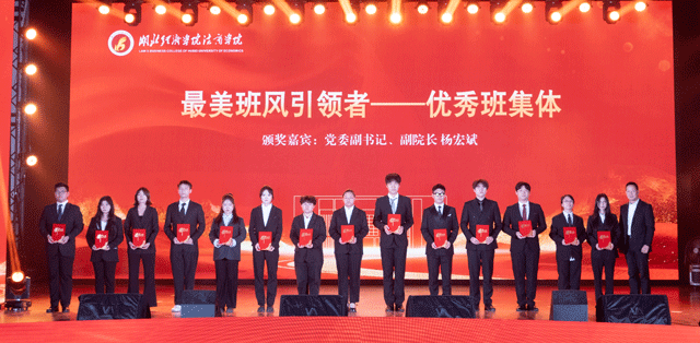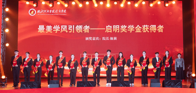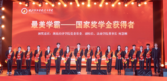 湖北經(jīng)濟(jì)學(xué)院黨委常委、副校長、法商學(xué)院董事長何慧剛教授為國家獎學(xué)金獲得者頒獎