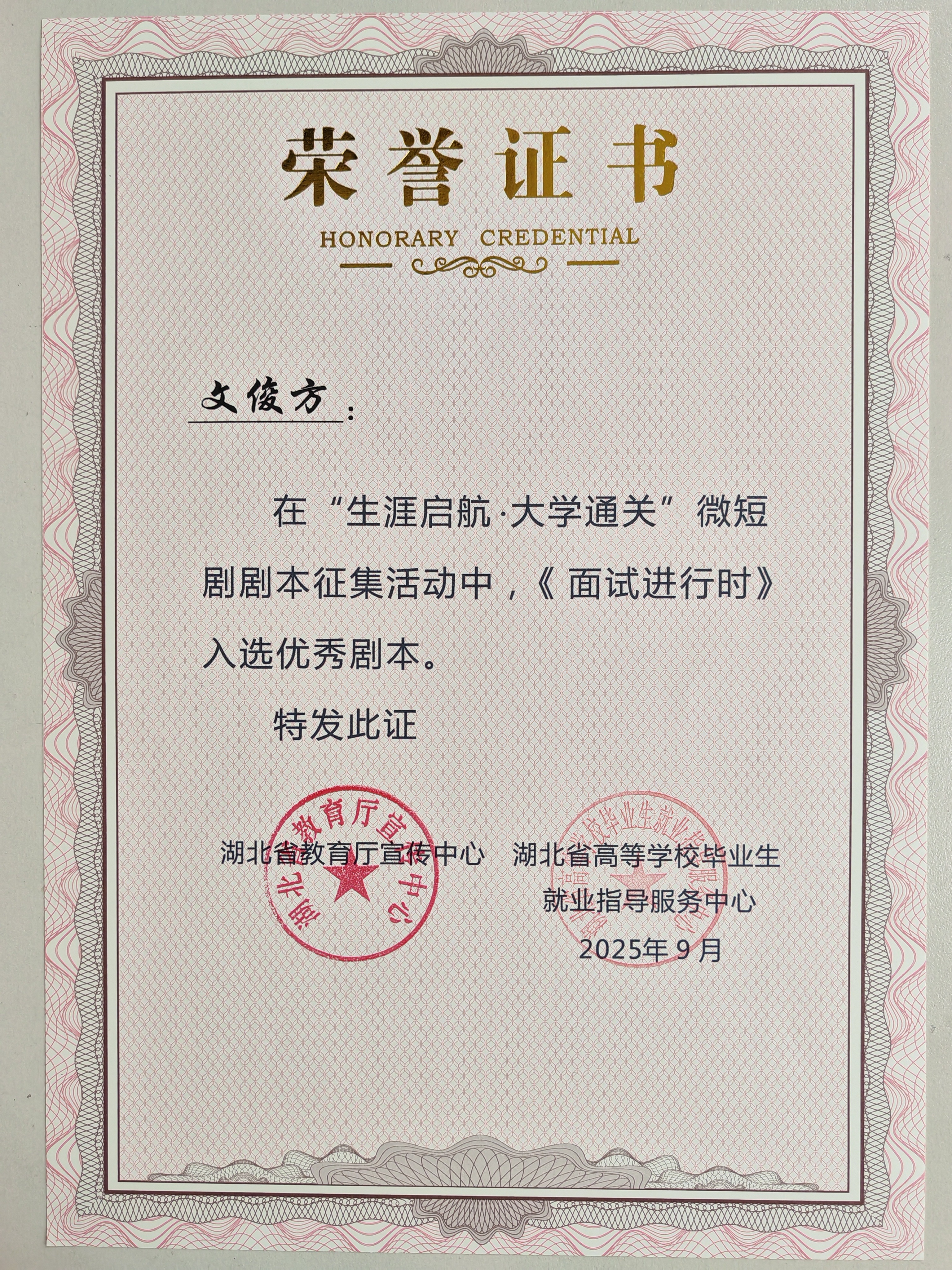 近日,湖北省“生涯啟航·大學(xué)通關(guān)”微短劇劇本征集活動評選結(jié)果揭曉,我院工商管理系輔導(dǎo)員文俊方創(chuàng)作的劇本作品從400多個參賽劇本中脫穎而出,獲評優(yōu)秀劇本獎。