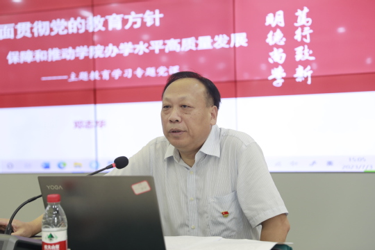 鄧志華以《全面貫徹黨的教育方針,以高質(zhì)量黨建,保障和推動(dòng)學(xué)院辦學(xué)水平高質(zhì)量發(fā)展》為主題,圍繞習(xí)近平總書(shū)記關(guān)于教育的重要論述,從黨的建設(shè)是學(xué)院教育事業(yè)高質(zhì)量發(fā)展的重要保障、黨的建設(shè)是學(xué)院教育事業(yè)發(fā)展的重要推動(dòng)力量、高校黨的建設(shè)是高校學(xué)生思想政治教育的重要保障、高校黨的建設(shè)是高校師生和全體工作人員的思想精神力量四個(gè)方面,結(jié)合自身主題教育學(xué)習(xí)體會(huì)、聯(lián)系學(xué)院工作實(shí)際進(jìn)行了深入闡述。
