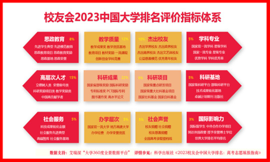 校友會2023中國大學排名評價指標體系由辦學層次、思政教育、教學質(zhì)量、杰出校友、高層次人才、學科專業(yè)、科研項目、科研基地、科研成果、社會服務、社會聲譽和國際影響力等12個一級指標構成,以艾瑞深“大學360度全景數(shù)據(jù)平臺”為數(shù)據(jù)支持,涵蓋700多個體現(xiàn)中國大學辦學質(zhì)量與辦學水平的核心評測指標,引導中國大學提升服務國家地方經(jīng)濟社會發(fā)展的能力與貢獻。