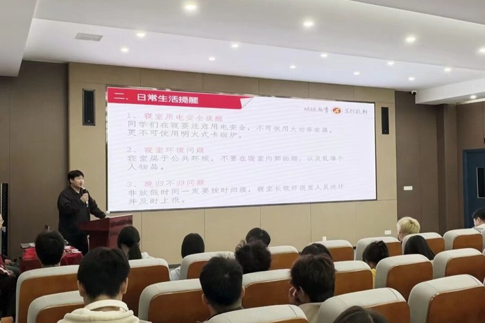 馬華強(qiáng)老師以“提高反詐安全意識(shí),共建平安和諧校園”為題進(jìn)行反詐知識(shí)宣講;李天老師為新生開(kāi)展晚講評(píng),講解一周事務(wù)。